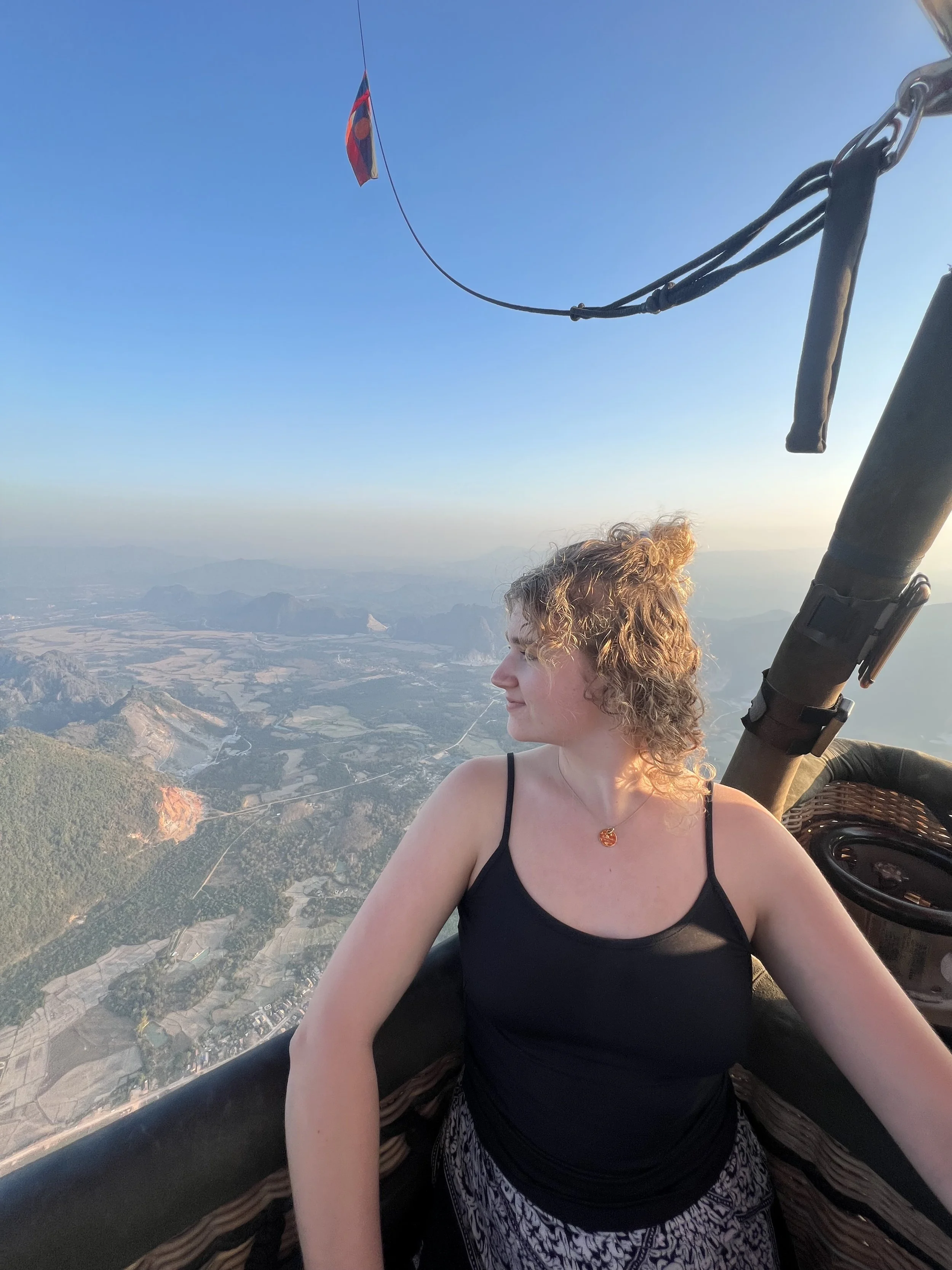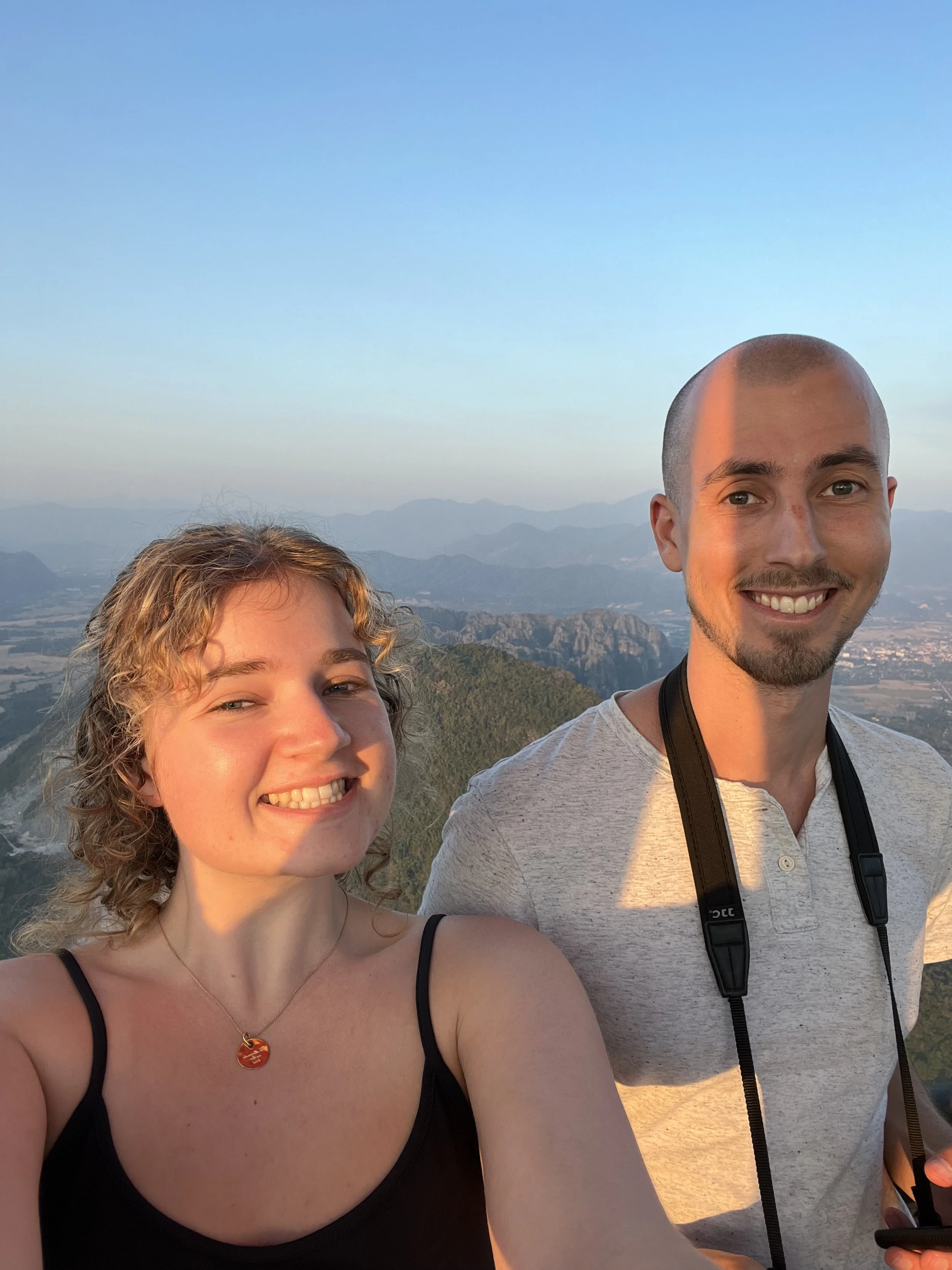 After Pakse, we flew up to Vientiane. Flying meant that we got to avoid taking a sleeper bus, which we were more than happy to avoid! Vientiane really surprised us, as we were expecting a pretty dull city, since that’s what people said online. However, it was actually very pretty. They have their own version of the Arc de Triomphe, called the Patuxay Monument, which was beautiful. We only walked around for the afternoon, as the next day we got a morning bus to Vang Vieng. A place I was extremely excited for, because it meant I got to go up in a hot air balloon for sunset. An experience that has been on my list for years, and it was an incredible! It felt almost surreal being that high up. I had no gauge for how high we really were, but our peak hight was around 1500m according to our captain. Which my brain just couldn’t really comprehend. The night before hot air ballooning, we hiked up to a viewpoint for sunset, which was relatively difficult and felt very high up. When we were in the balloon, we were looking down on that viewpoint, which was crazy to me!