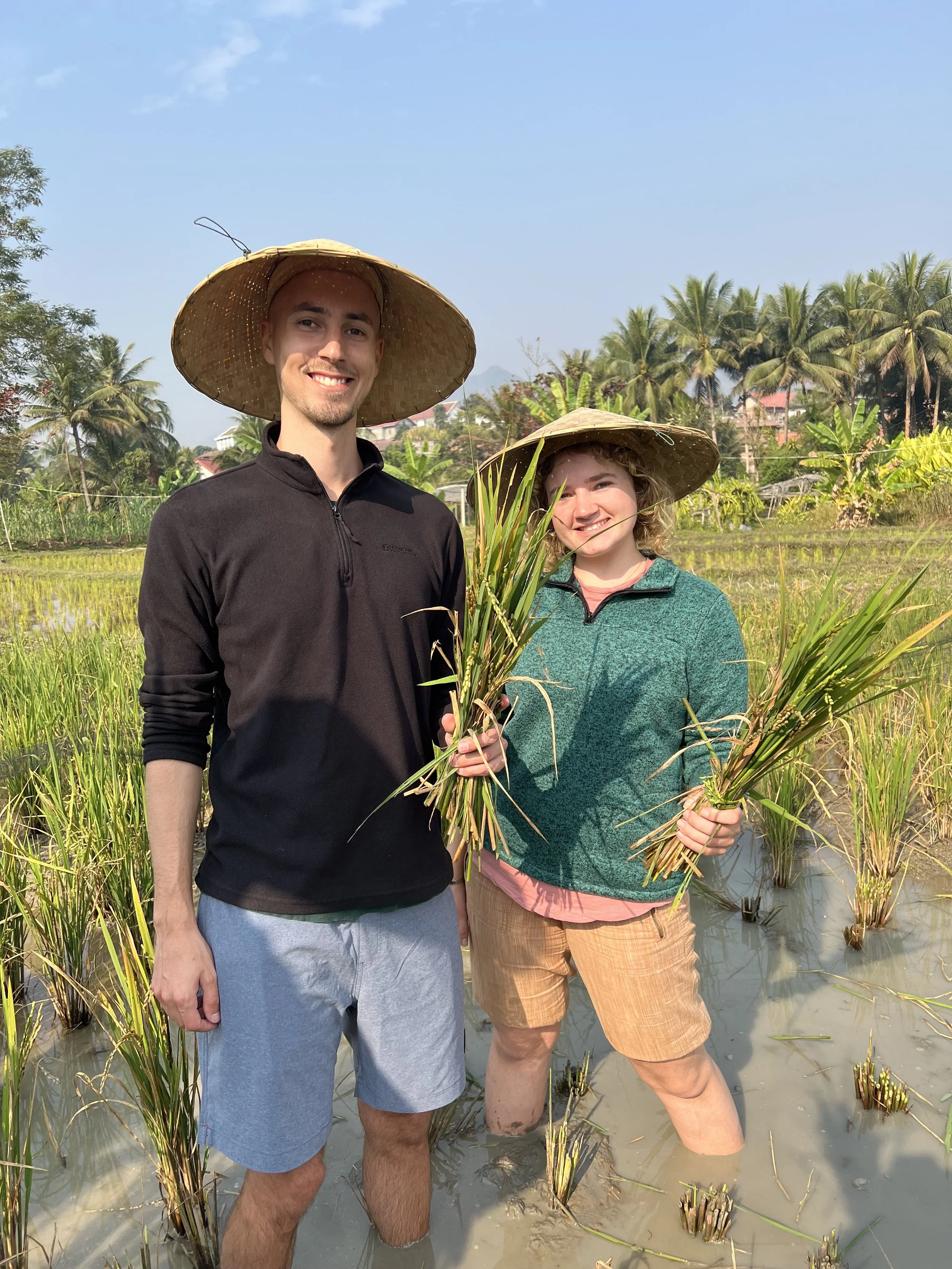 From Nong Khiaw, we took a van back to Luang Prabang, with the most chaotic van driver we have ever had. He had no calm bone in him and was flying over those pot holes. I don’t know if he knew brakes were a thing. Ben and I were flying around in the back. We made it to the town alive and then had few days to explore the capital of Laos. We went to the famous Kuangsi Falls, which were just amazing. We managed to find a British couple who booked a private tuk tuk with us to head off early in the morning to beat the crowds, which was totally worth it as we had the place to ourselves for a good hour and a half. On our last day in Luang Prabang, we did a rice planting experience with The Living Land Farm. This was a super fascinating morning learning how rice goes from farm to table. We got to plant grains, transplant baby rice, harvest fully grown rice, pound it, separate gain and husk, cook it, and the best part, eat it. It was an educational experience, and very fun!