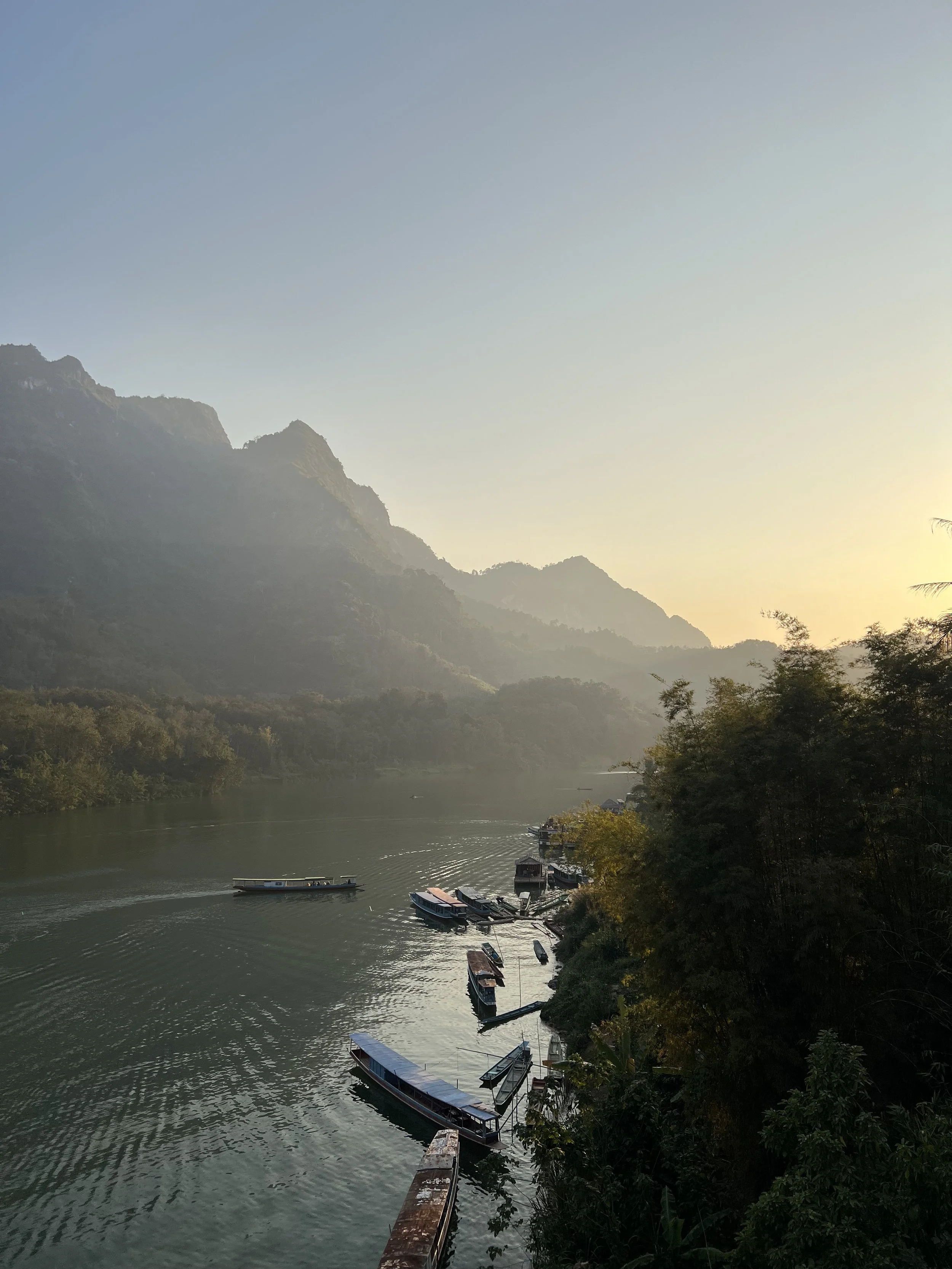 From Vang Vieng, we took the new high speed train up to Luang Prabang, and then transferred to a van, to Nong Khiaw. This road was the most pot hole covered road ever. Kind of impressive there could be that many. Our driver loved accelerating and breaking harshly between every set as well! After the bumpy journey, we arrived in Nong Khiaw and decided we wanted to hike up to a viewpoint for sunset. Which seems to be a trend with us now! The viewpoint was stunning as we could see the whole town with the river running through it. Once we hiked down, we rewarded ourselves with a shared slice of carrot cake from Delilah’s. Just yum.